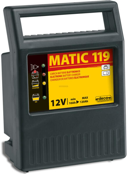 Deca MATIC 119 - Hordozható töltő 12V-s ólom-savas indító akkumulátorok (autó, motor) töltéséhez. Effektív töltőáram értéke 9A (átlag 6A) . Akkumulátor kapacitása 10-120Ah közötti. A töltő használatával meghosszabbíthatja akkumulátora élettartamát.