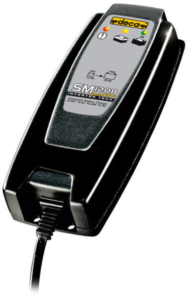 Deca SM 1208 / SM C8 - Hordozható töltő 12V-s ólom-savas akkumulátorok (zártrendszerű, gondozásmentes, klasszikus ólom-savas, zselés, VRLA) töltéséhez (impulzusos töltés). Töltőáram értéke 0.8A . Akkumulátor kapacitása 1.2-35Ah közötti. A töltő használatával meghosszabbíthatja akkumulátora élettartamát. Többlépéses töltés: az akkumulátorok töltése kifinomult, többlépéses programok alkalmazásával történik .