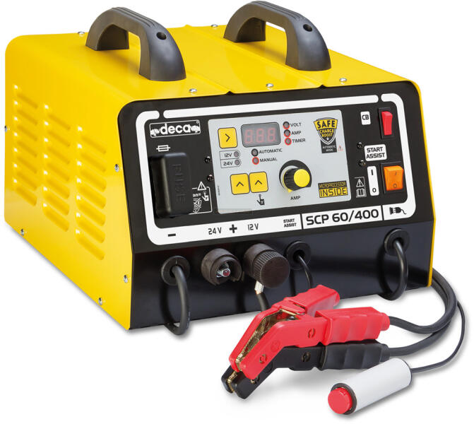 Deca SCP 60/400 - Hordozható, professzionális, mikroprocesszorral vezérelt töltő 12/24V-s ólom-savas indító akkumulátorok (autó, motor) töltéséhez indításrásegítő funkcióval. Effektív töltőáram értéke 60.0A (átlag 40A) . Akkumulátor kapacitása 5 - 800Ah közötti. A töltő használatával meghosszabbíthatja akkumulátora élettartamát. Az indításrásegítő funkcióval beindíthatja gépjárművét.