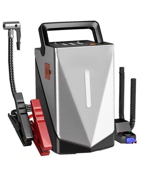 GF01 8 az 1-ben Autó Bikázó Powerbank: A tökéletes útitárs ? A GF01 8 az 1-ben autó bikázó powerbank egy multifunkcionális eszköz, amely nem hiányozhat egyetlen autó tulajdonosának sem. Legyen szó lemerült akkumulátorról, defektről, vagy egyszerűen csak egy powerbankre van szükséged, a GF01 a megoldás! Főbb előnyök:Akkumulátor bikázás: 2000A csúcsárammal 1-3 másodperc alatt beindítja a lemerült akkumulátort. Akár 40+ bikázásra is képes egyetlen töltéssel. ⚡ Gyors légkompresszor: 25L/perc teljesítményű, dupla olyan gyorsan fújja fel a gumikat, mint a hagyományos eszközök. ⏱️ Fújó funkció: 250L/perc légmennyiséggel pillanatok alatt felfújja/leereszti a sátrakat, matracokat. Akár a grillszenet is begyújtja! ? Powerbank: 12000mAh kapacitással feltölti telefonodat, tabletedet. ? LED lámpa: 3 világítási mód (zseblámpa, figyelmeztető fény, SOS jelzés) a biztonságért. ? További funkciók és előnyök:9 beépített biztonsági funkció: Védelem a túltöltés, rövidzárlat, túlmelegedés ellen. ?️ Strapabíró kialakítás: -20 és 60°C közötti hőmérsékleten is megbízhatóan működik. ? Hordozható: Kompakt méretének köszönhetően könnyen magaddal viheted. ? Nagy, valós idejű kijelző: A LED kijelző valós idejű adatokat mutat a nyomásról. Előre beállított módok: A gyors légkompresszor 4 előre beállított móddal és automatikus kikapcsolással rendelkezik Műszaki adatok:Jellemző ÉrtékModell GF-01Anyag ABS műanyagIndítóáram 2000A csúcsáramFelfújási kapacitás 25 l/percMaximum nyomás 150 psiAkkumulátor kapacitás 12000 mAhTöltés 5V, USB-CKimenet 5V/2A, USB-AMéret 172 x 106 x 102 mmSúly 1800 gTanúsítványok FCC, CE, MSDS, ROHSHasználati útmutató:Autó bikázás: Csatlakoztasd a kábeleket az akkumulátorhoz, kapcsold be az eszközt, és indítsd az autót! Gumi felfújása: Csatlakoztasd a pumpa csövét, állítsd be a nyomást, és indítsd el a kompresszort. LED fények: Válaszd ki a megfelelő üzemmódot a helyzetnek megfelelően. Felfújhatók kezelése: Egyszerűen csatlakoztasd a fújó csövet a felfújandó eszközhöz. A GF01 8 az 1-ben autó bikázó powerbank egy sokoldalú és megbízható eszköz, amely biztonságot nyújt az utakon és a szabadban egyaránt. Ne indulj el nélküle!