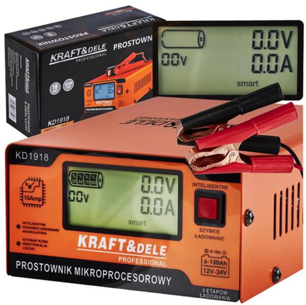 Kraft&Dele Automata akkumulátortöltő, 4 féle üzemmóddal, 12-24V/10 A, KD1918 A lengyel Kraft&Dele cég KD1918 mikroprocesszoros egyenirányítója egy megbízható egyenirányító eszköz minden típusú ólom-savas akkumulátor (WET/MF/CA/EFB/GEL/AGM) töltéséhez. Az akkumulátor töltési ideje a névleges kapacitásától és a kisütés mértékétől függ. A töltőnek 4 üzemmódja van: