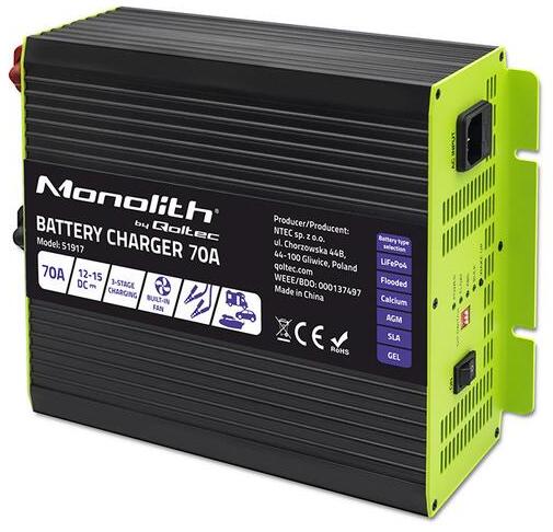 Qoltec Smart Monolith töltő LiFePO4 AGM GEL SLA akkumulátorokhoz | 70A | 12V | Gyors töltés (QC-51917)