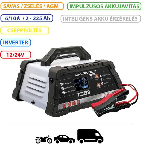 Mastroweld SMART-20 Inverteres Akkumulátortöltő: Intelligens töltés motorokhoz, autókhoz és kisteherautókhoz ?? Ez az intelligens akkumulátortöltő tökéletes választás motorok, személygépkocsik és kisteherautók akkumulátorainak töltéséhez. A beépített inverteres technológiának köszönhetően hatékony és biztonságos töltést biztosít. Főbb jellemzők:12V/24V automata felismerés: A töltő automatikusan felismeri az akkumulátor feszültségét. Intelligens akkumulátor érzékelés: Optimális töltési folyamatot biztosít minden akkutípushoz. Pulse Repair funkció: Segít az akkumulátor regenerálásában. Állandó feszültségű csepptöltés: Megakadályozza az akkumulátor túltöltését. Automata töltésmegszakítás: Biztonságos és kényelmes használatot biztosít. Fordított polaritás és rövidzárlat elleni védelem: Védi az akkumulátort és a töltőt a károsodástól. Savas, zselés és AGM akkumulátorok töltése: Sokoldalú megoldás különböző akkutípusokhoz. Szigetelt testcsipeszek: Biztonságos használatot biztosít. Töltőáram kijelzés: Könnyen nyomon követhető a töltési folyamat. Kényelmes használat: Az akkumulátort nem kell lecsatlakoztatni a járműről a töltés során. Műszaki adatok:Paraméter ÉrtékHálózati feszültség 230 V - 50/60 HzBemenő teljesítmény 345 WTöltő feszültség 12V / 24VTöltőáram (12V) 10 ATöltőáram (24V) 6 ATölthető akku kapacitás 2-225 AhVédelmi osztály IP21SSzigetelési osztály FMéretek 252 x 200 x 109 mmNettó súly 1,8 kgBruttó súly 2,1 kgGarancia: 1 év