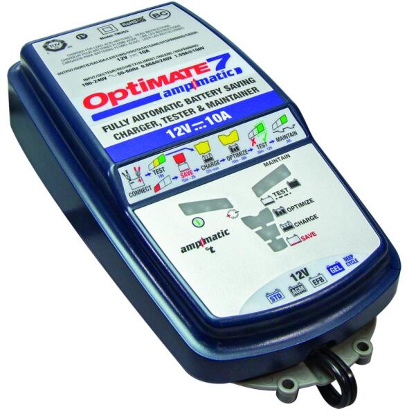 Tecmate OptiMate 7 automata tölt Optimate 7 - Automata töltő 12V-s ólom-savas akkumulátorok (zártrendszerű, gondozásmentes, klasszikus ólom-savas, zselés, VRLA) töltéséhez és szulfátlanításához. Maximális töltőáram értéke 10A . Akkumulátor kapacitása 3-400Ah közötti. Ideális megoldás otthoni használatra 12V-s akkumulátorokhoz, újraélesztő és csepptöltő funkcióval . A töltő használatával meghosszabbíthatja akkumulátora élettartamát.